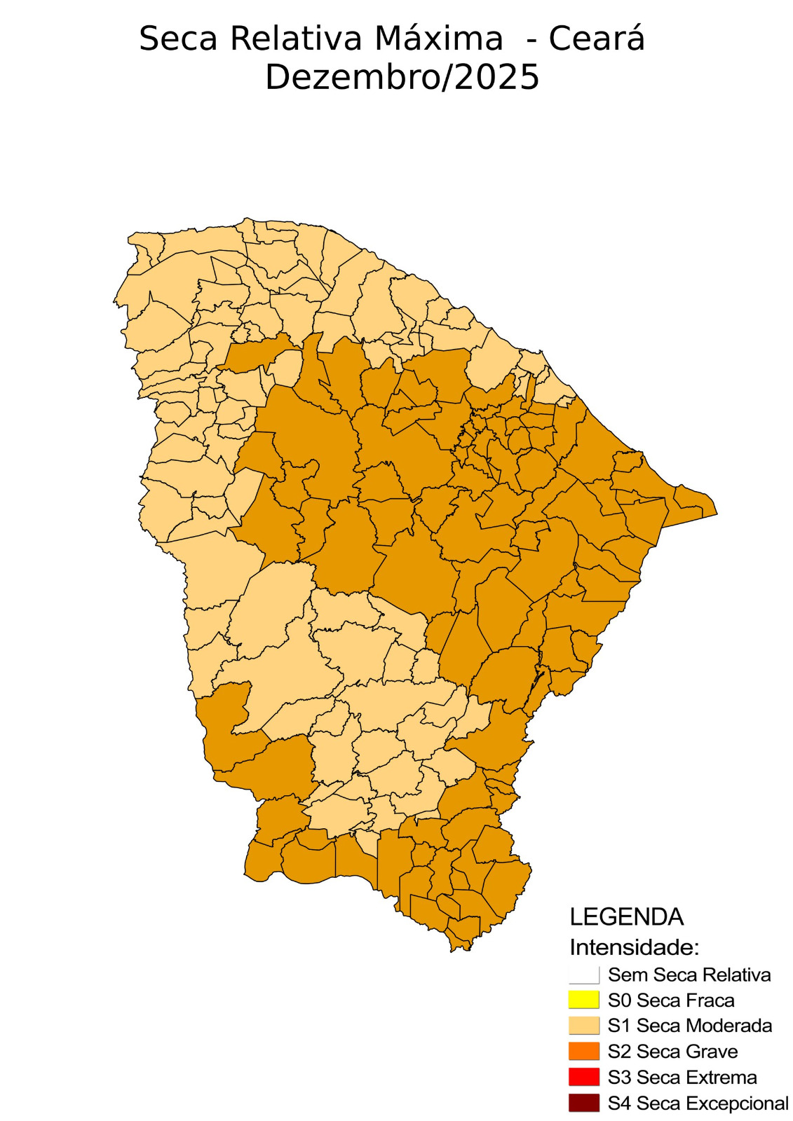 O Monitor de Secas aponta que o Ceará enfrentou, em dezembro de 2025, o quadro mais severo de seca grave dos últimos quase seis anos, com 93 municípios classificados com seca grave (S2) e 91 com seca moderada (S1), evidenciando a ampliação do problema em relação a novembro de 2025, quando 65 municípios estavam nessa condição.