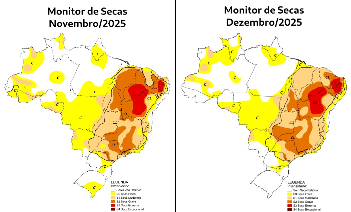 De acordo com o Monitor de Secas, houve avanço na intensidade e na extensão das secas moderadas e graves no norte do estado, em decorrência das anomalias negativas de precipitação e da piora dos indicadores climáticos. Em contrapartida, no oeste, foi observado recuo da seca grave, associado à melhoria desses indicadores. O levantamento aponta ainda que os impactos passaram a ser de curto e longo prazo (CL).