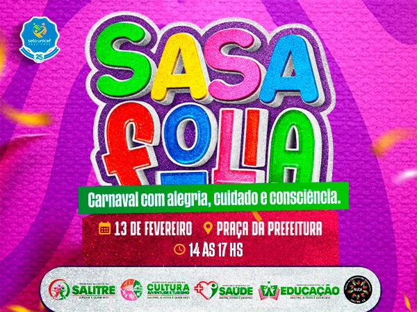 O município de Salitre promove, no próximo 13 de fevereiro, o SasaFolia, evento carnavalesco com programação voltada à convivência comunitária e ações de orientação à população.